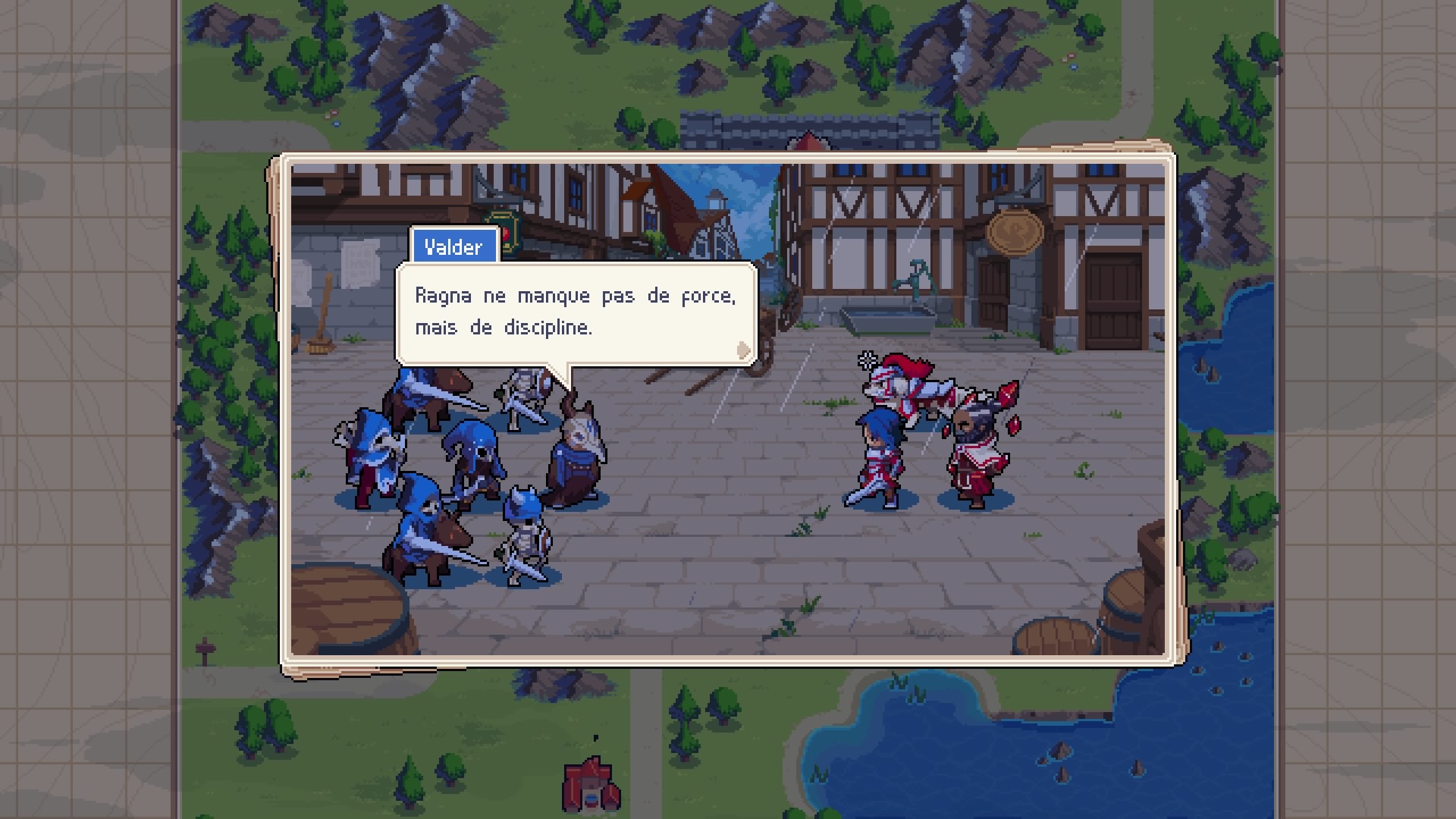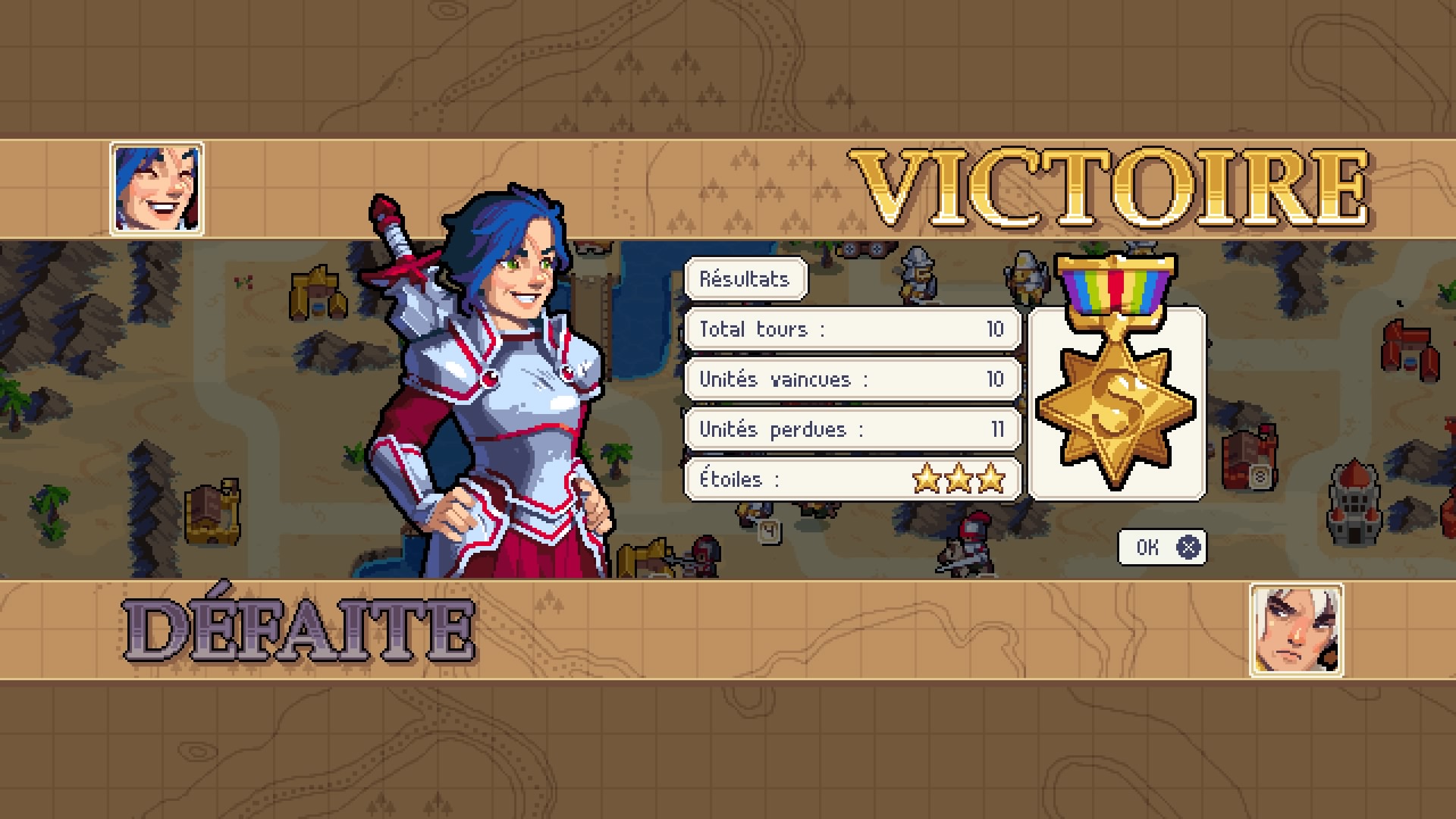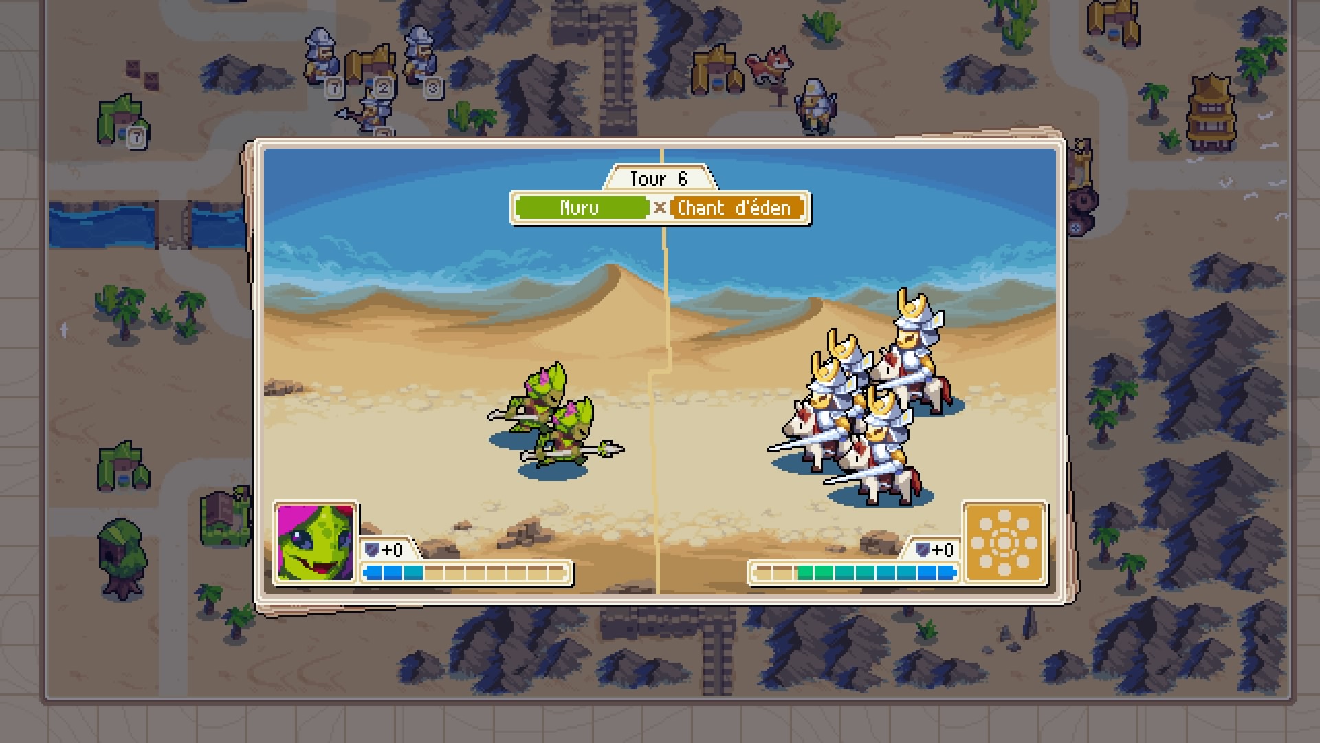 Le style pixel art, qui rappelle aussi Advance Wars, fonctionne à merveille. Le chara-design des unités est réussi et les petites animations qui ponctuent les combats ou les cinématiques sont fluides et agréables à l’œil. L’apparence de certaines des unités varie d’ailleurs d’un camp à l’autre ce qui ajoute un petit plus. C’est bien la seule différence entre elles puisque contrairement à son modèle, Wargroove ne donne pas d’avantage à certains types d’unité en fonction du commandant qui les dirige. L’équité est de rigueur.