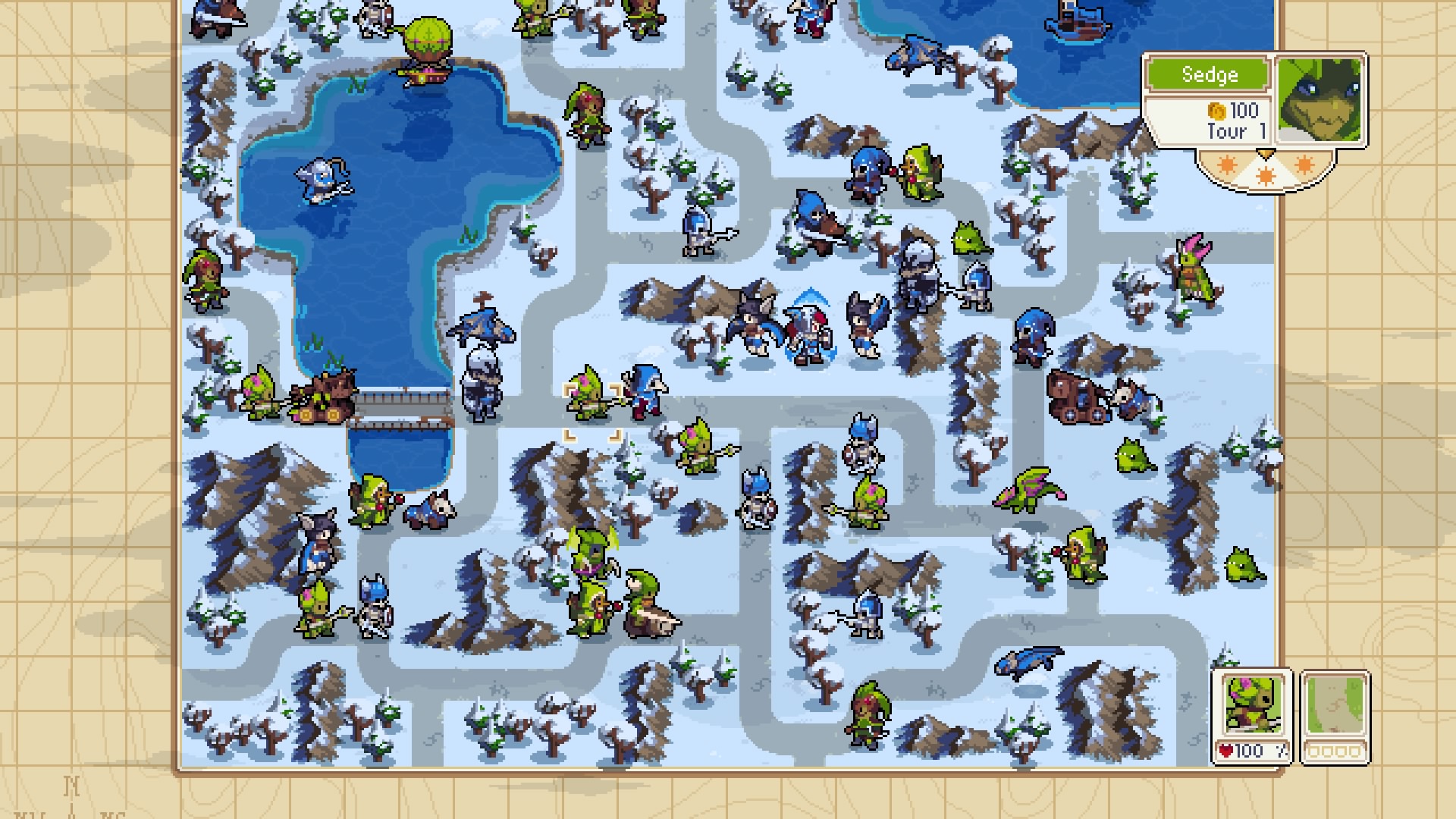 Le principe des batailles en lui-même est assez simple. Chaque unité possède 10 PV et se déplace sur la map constituée de cases. Lorsque l’on attaque une autre unité, on lui retire un certain nombre de PV mais attention, si nous sommes à portée de l’ennemi, celui-ci pourra riposter sur le champs et l’on perdra à notre tour de la santé. Par conséquent, si notre attaque se porte sur un adversaire dont le type a l’avantage sur le nôtre, on peut très bien infliger moins de dégâts que nous allons en recevoir. Logiquement, moins l’unité a de PV, moins sa force de frappe sera importante. Prudence dans les choix des attaques lancées.
