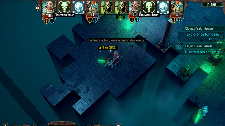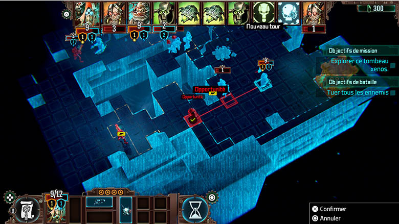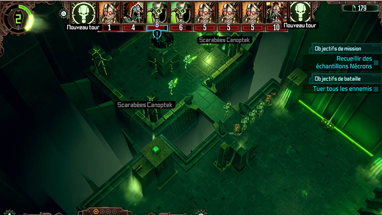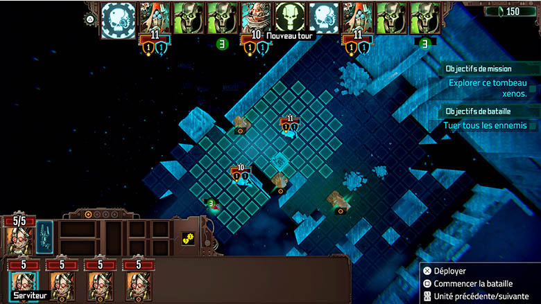 En effet, on se rend rapidement compte que les unités comme les serviteurs ont pour principal intérêt de servir de chair à canon et de permettre aux techno-prêtres de mener à bien leur mission. En effet, les techno-prêtres sont les unités à privilégier dans le jeu, donc on en vient rapidement à faire des sacrifices pour garder nos pièces les plus importantes, qui sont aussi les seuls à pouvoir récolter les points de capacités. Ceux-ci sont importants, car ils permettent soit d’invoquer des serviteurs en début de tour, servant de chair à canon comme nous le disions plus tôt, soit d’utiliser des armes plus puissantes, permettant de vaincre les Nécrons. Dans tous les cas, le système de jeu est plaisant et se prend rapidement en main, même s’il faudra un moment pour réussir à établir des stratégies viables. De plus, le portage est de très bonne qualité, car prenant en compte la manette. Plutôt que de contrôler tout le jeu avec un bouton et les stick comme si c’était une souris, on se retrouve à utiliser plusieurs touches de la manette, chacune ayant une action bien précise. Le positionnement des touches est intuitif et on prend rapidement le jeu en main, ce qui est un excellent point.