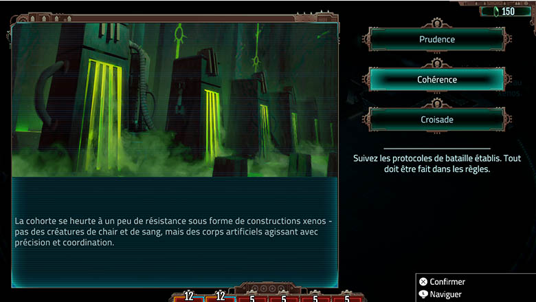 Entre chaque mission, il nous est possible d’améliorer nos techno-prêtres, leur permettant de débloquer de nouvelles armes ou encore des capacités spéciales, nous permettant de réussir les missions que nous devrons effectuer. C’est à ce moment qu’il nous faudra faire une équipe développée, avec une synergie entre ses membres pour obtenir la victoire. Pour améliorer nos personnages, il nous faudra récolter une ressource spécifique lors de nos aventures ou à la fin d’une mission : les pierres noires. Cette ressource est donc essentielle pour améliorer nos personnages et nous oblige à faire des choix. Une fois prêt, nous pouvons nous lancer dans une nouvelle mission, en composant notre équipe, composée de techno-prêtres et d’autres unités, ainsi qu’un cantique, nous permettant d’avoir un effet passif supplémentaire, qui peut faire toute la différence.