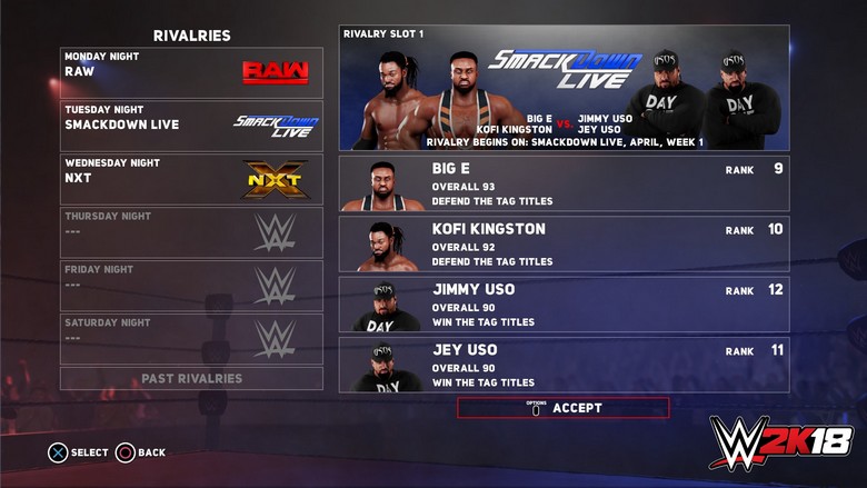 Les rivalités actives seront désormais classées dans 4 catégories dans une mécanique intitulée Intensité. Si le niveau est faible, il s’agit d’une rivalité amicale où les Superstars se respectent, viennent ensuite les niveaux Moyen, Grand et Très Grand qui, vous vous en doutez, traduira la tension créée par la rivalité, de l’échange de noms d’oiseaux jusqu’au passage à travers la table des commentateurs. Évidemment, le niveau pourra évoluer, plus la rivalité est longue plus la tension montera. Il se pourra qu’elle commence au niveau moyen pour atteindre le plus élevé.